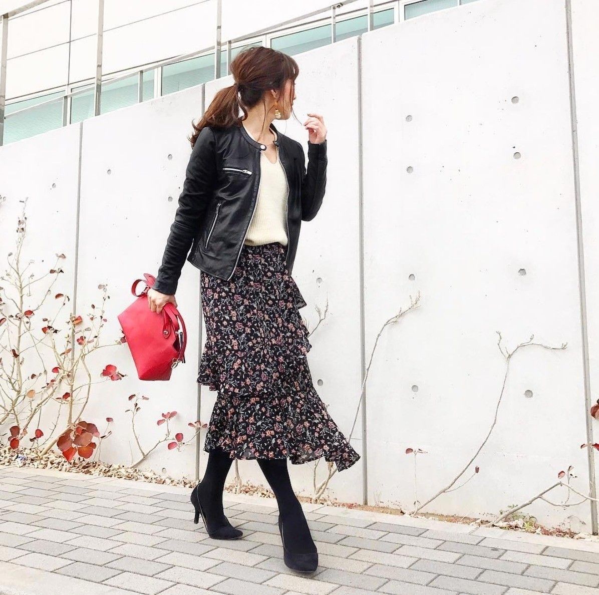 「ラッフルフレアミディスカート」は揺れるフリルが女性らしさを盛り上げてくれる可愛いスカート。黒ベースなら、大人可愛い着こなしが楽しめるはず。辛口なライダースと合わせて甘辛バランスを。