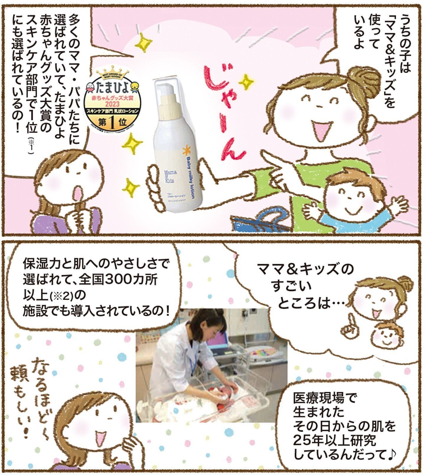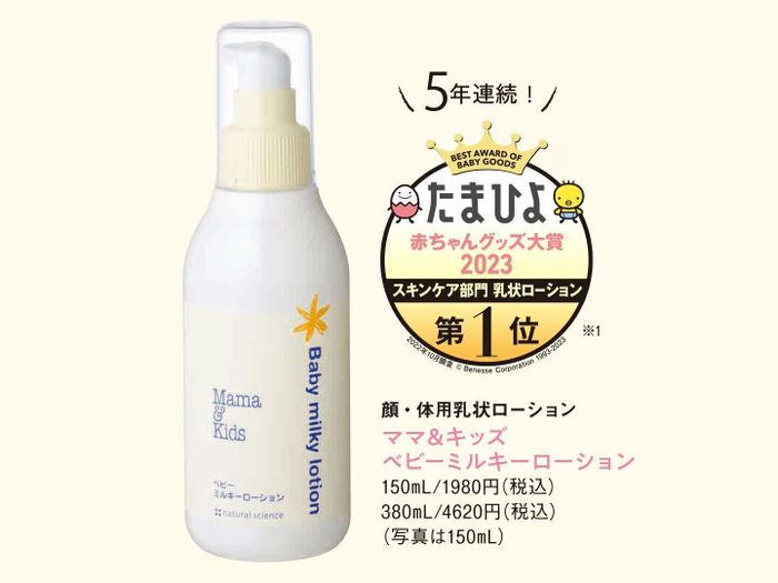 「のびがよくてベタつかない」「保湿力が違う」と多くのママ・パパたちの支持を集めている、「ママ&キッズ」のベビースキンケア。ベビーミルキーローションは5年連続でたまひよ赤ちゃんグッズ大賞の第1位※1を受賞しているんです! ここでは3つのこだわりをギュギュっとまとめて紹介します。