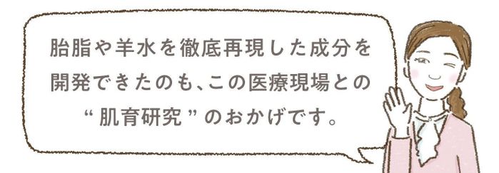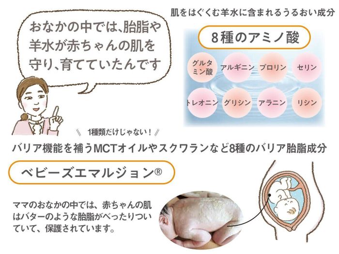 【こだわり1】未熟なまま生まれる赤ちゃんの肌のために、胎脂と羊水がお手本の保湿成分を配合