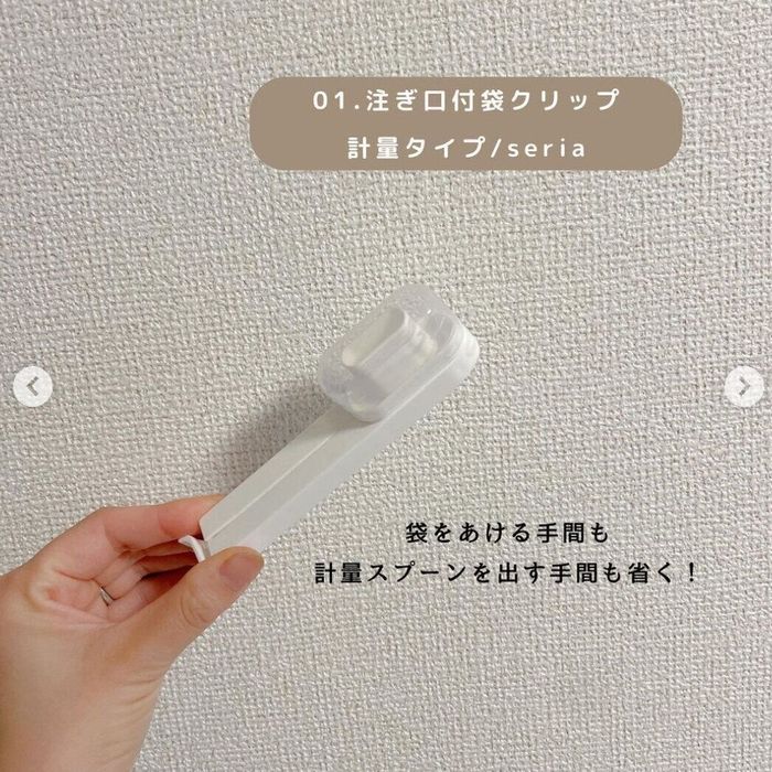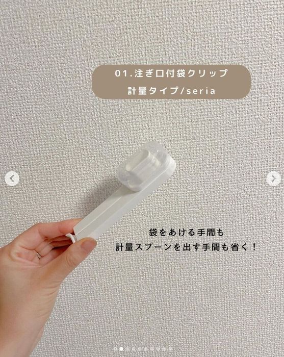 こちらは__miii0731_2ldkさんがセリアで購入した「注ぎ口付袋クリップ 計量タイプ」。袋の口を閉じるクリップに注ぎ口が付いている便利アイテムなのだそう。注ぎ口のふたは計量カップになっており、小さじや大さじが計れるのだとか。袋を開けたり計量スプーンを出したりする手間が省けるとのこと♪