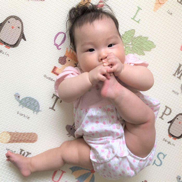自分の足をつかんでいることが増えたなと思っていたら、そのまま口に! 体のやわらかさにびっくりです。ちなみに母によれば私も赤ちゃんのころ、こうしてよく足の指をしゃぶっていたそうです(笑)。