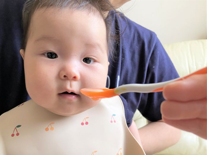 5カ月になり、離乳食を始めた山之内周音(あまね)ちゃん。初日は10倍がゆを恐る恐るごっくんしていましたが、慣れてくると自分でスプーンをつかんでお口に運ぶことも!ママ・パパも「食いしん坊になるに違いない!」と周音ちゃんの食べっぷりに驚いています。