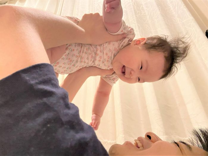 最近お気に入りは、“飛行機遊び”。パパがあお向けに寝転び、体の上で周音をうつぶせに抱っこ。周音の両わきをしっかり手で支えて抱っこしながら、体が床と並行になるように持ち上げる遊びです。パパが仕事から帰ってきて飛行機遊びをしてもらうとキャッキャとご機嫌に。周音の笑い声にパパも癒やされるそう。