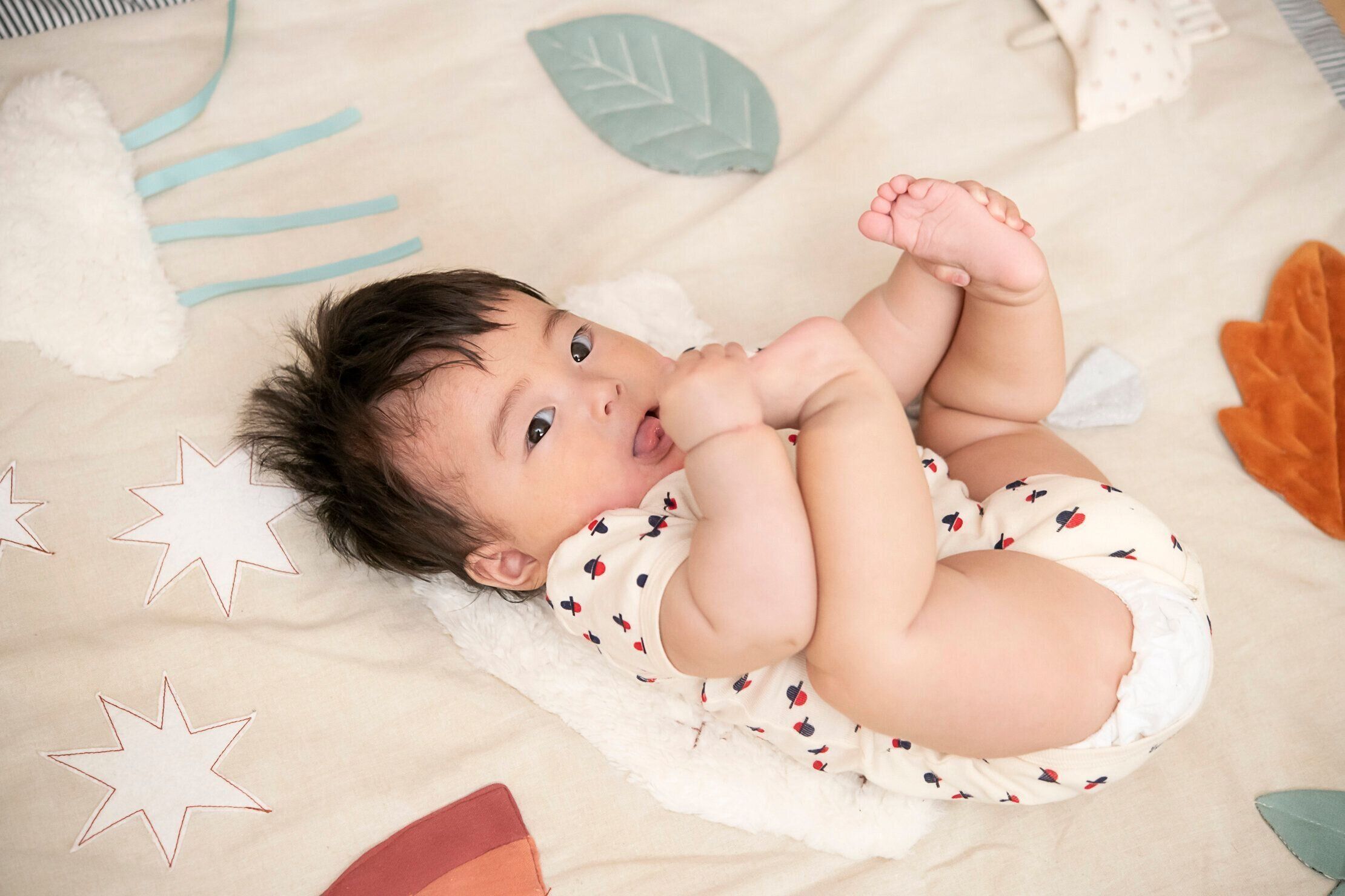 前月に自分の両足を発見した様子の柊(ひいらぎ)くん。まったりとつかんでひとり遊びしていましたが、ついに口に持っていってなめるようになりました。