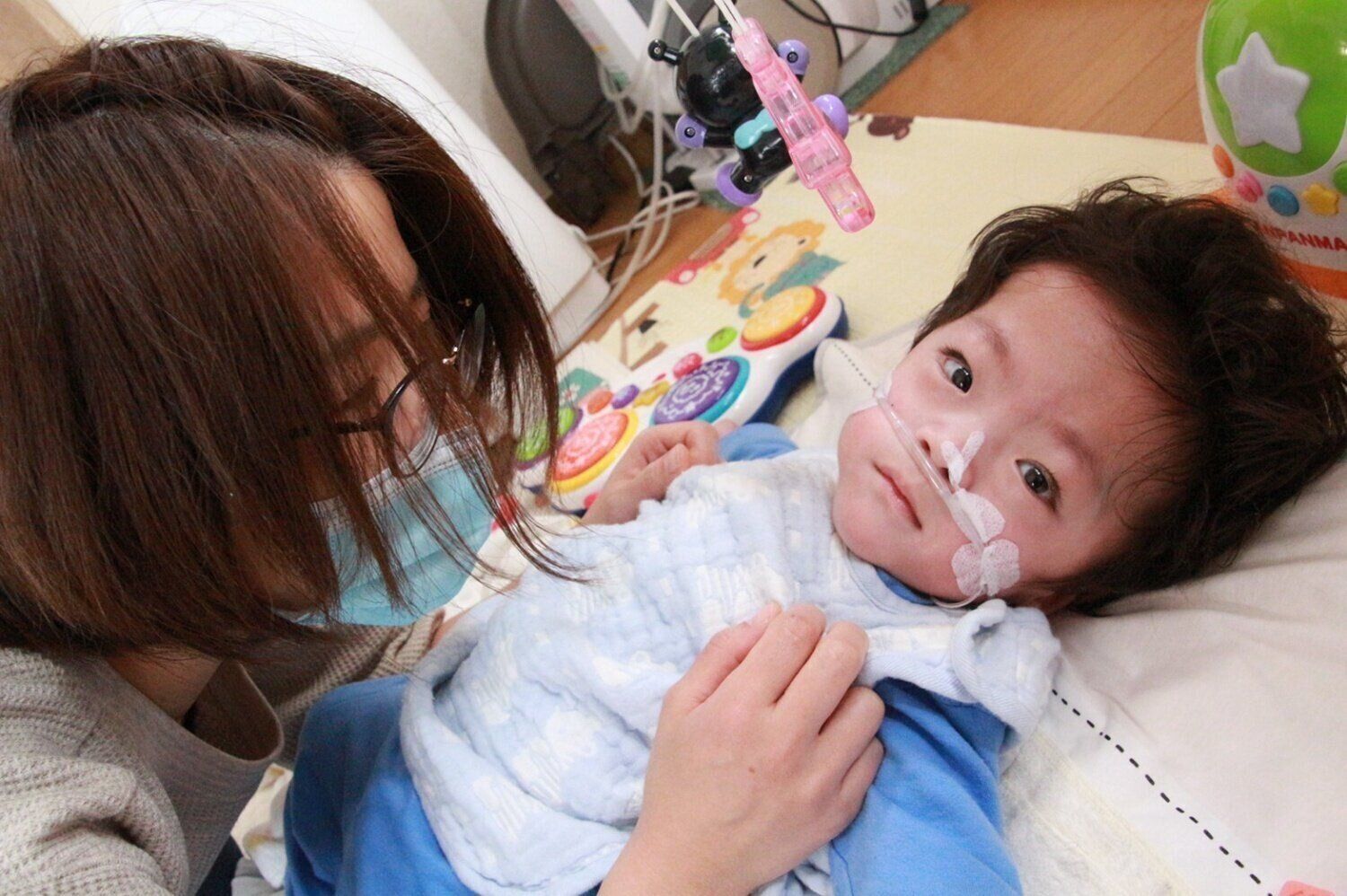 おなかのふくらみがなくなったしょうくんは、寝返りを打つなど運動発達が見られるように。自宅に帰り一緒に生活できるようになってからは、美都樹さんが酸素吸入や鼻からチューブを挿入する経鼻経管栄養法などを実践。今でも2週間に1度は通院し、酵素補充を行っています。