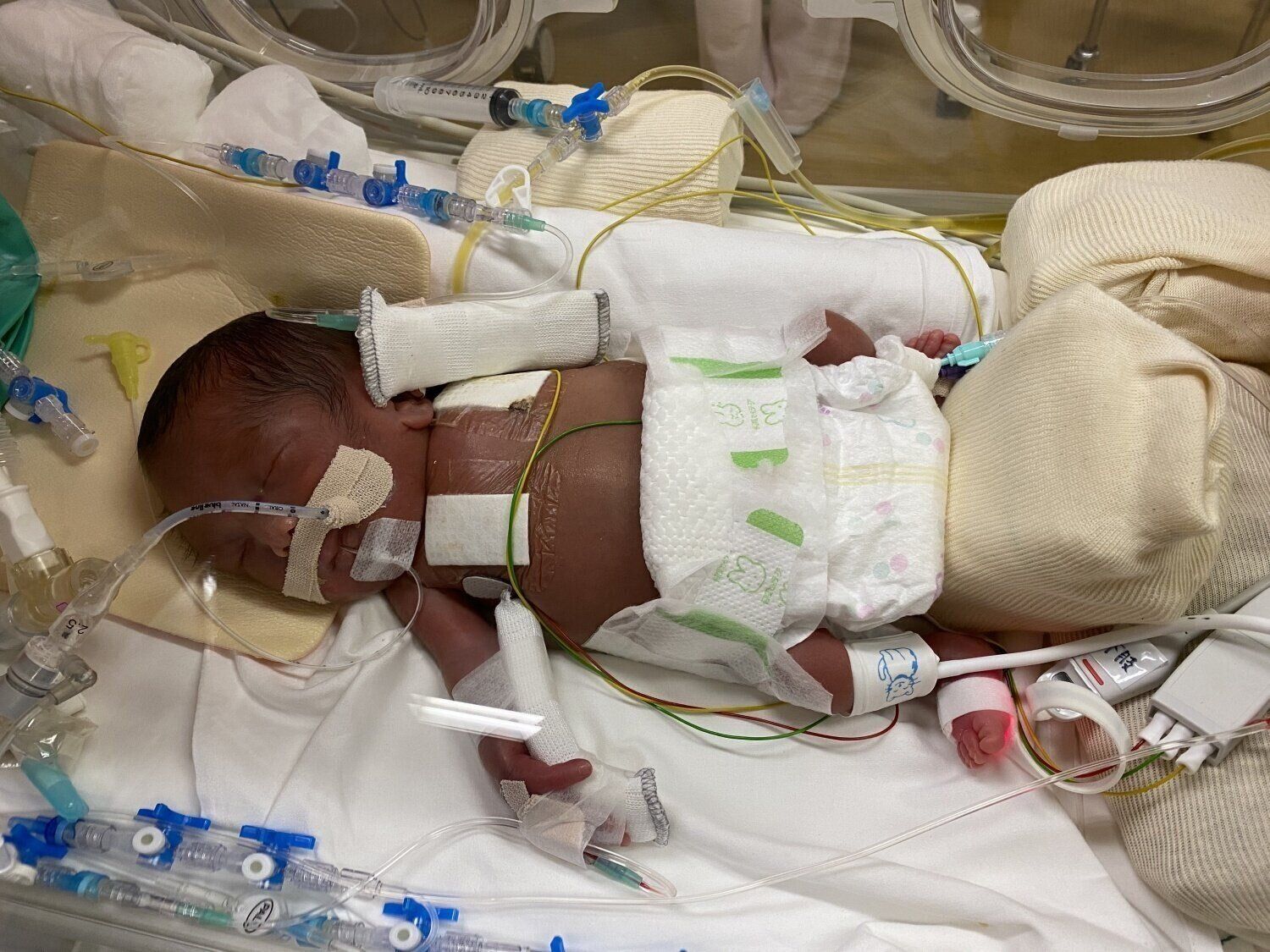 出産後、ただちにNICU(新生児集中治療室)へ運ばれたしょうくん。初めて対面したときには、人工呼吸器の装着をはじめ、手足にはたくさんの管がつなげられていたそうです。