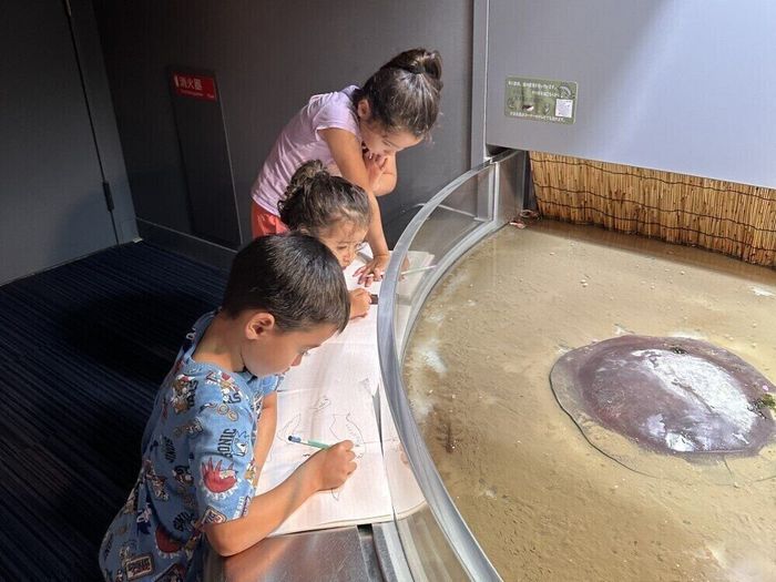 年間パスポートを購入すれば、大体の水族館は2~3回行けば元が取れちゃうから経済的で助かる。ただ魚を見に行くのではなく、ノートと鉛筆を持参して、お勉強も兼ねて通っています。小学生組は魚の絵を描くところからスタート。最近は、ひらがなのお勉強も進んでいるから、展示の標識を読んだり、ノートにコピーしたり。ちびっ子2人は、ただただ魚に圧倒されるだけだけど、毎回新しい発見があるみたいで必ず教えてくれます。