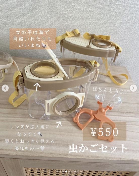 こちらはchiiiさんが550円で購入した3COINSの虫かごセット。虫かごは前面と上面にレンズがついており、中のものを拡大して観察できるのだそう。バグキャッチャーも付属しているようなので、虫が触れないお子さんにぴったりですね♪ 海で貝がらなどを入れるのも良さそうとのこと。