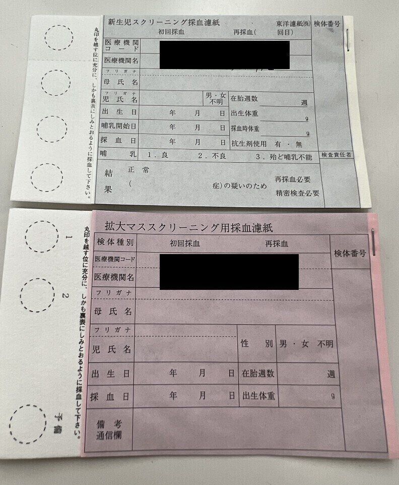 上が以前からある検査の採血ろ紙で、下が拡大新生児マススクリーニング検査のもの。両方実施する自治体では、この2枚が使われています。