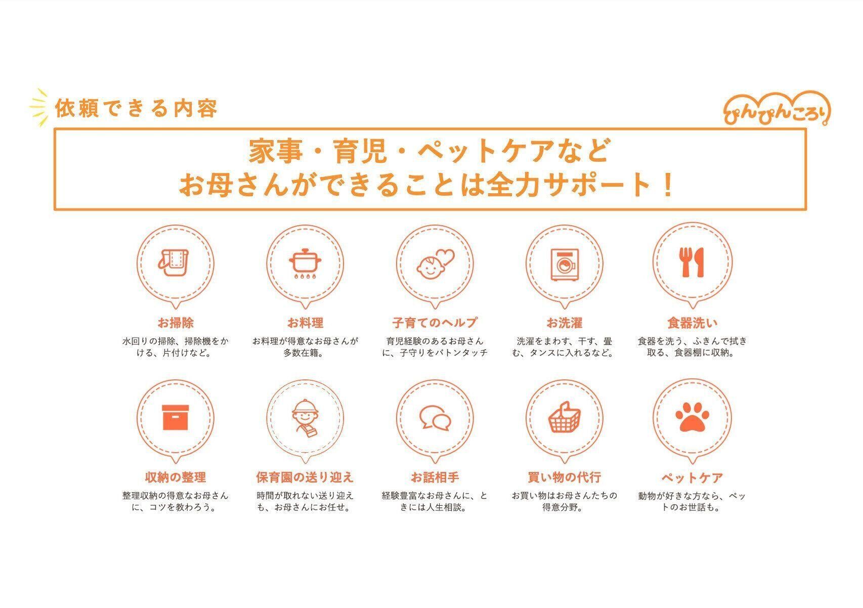 既に家事代行やベビーシッターサービスは多数ありますが、既存サービスとの大きな違いは、総合的なご家庭サポートサービスであることです。