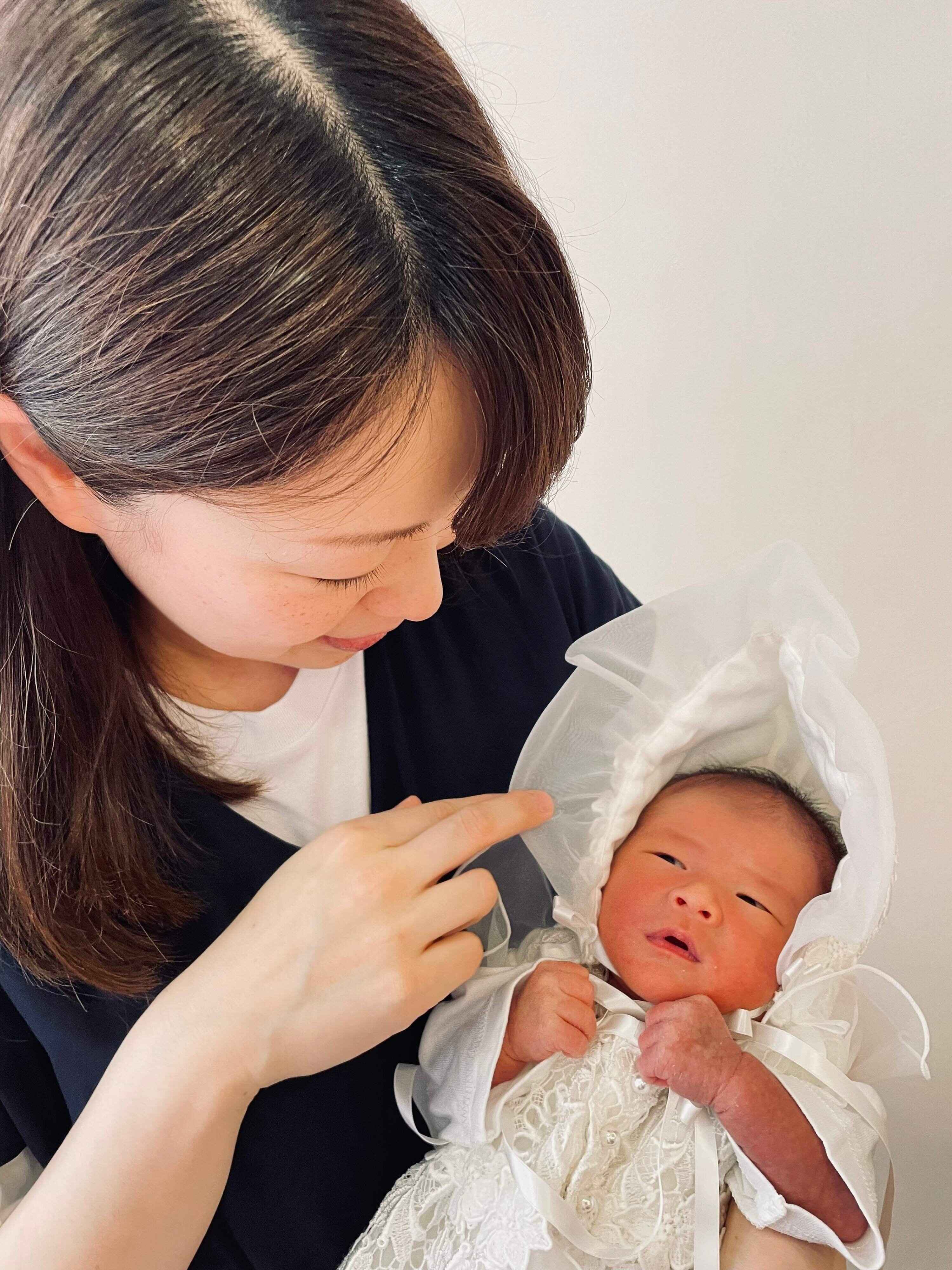 そうすけくんが産院を退院した日。舞さんのウエディングドレスをベビードレスに仕立て直しました