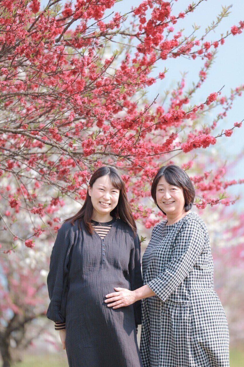 舞さんが妊娠8カ月のころ。三千代さんのカメラ仲間が撮影してくれたという、 2人の笑顔も花咲く風景も美しい1枚