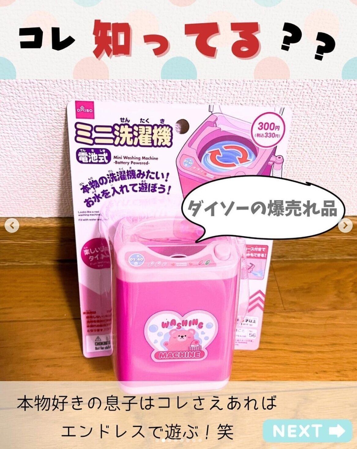 kirari_ikujiさんはダイソーでこちらの330円商品をGET!電池式のミニ洗濯機だそうで、実際に水を入れて小さな人形の服を洗うことができるそうです。ホースから排水できるクオリティの高さで、こちらのお宅ではお子さんが「エンドレスで遊ぶ!」と気に入っているとのこと。洗濯ばさみを使って人形の服を干す遊びを取り入れるのも良さそうです♪