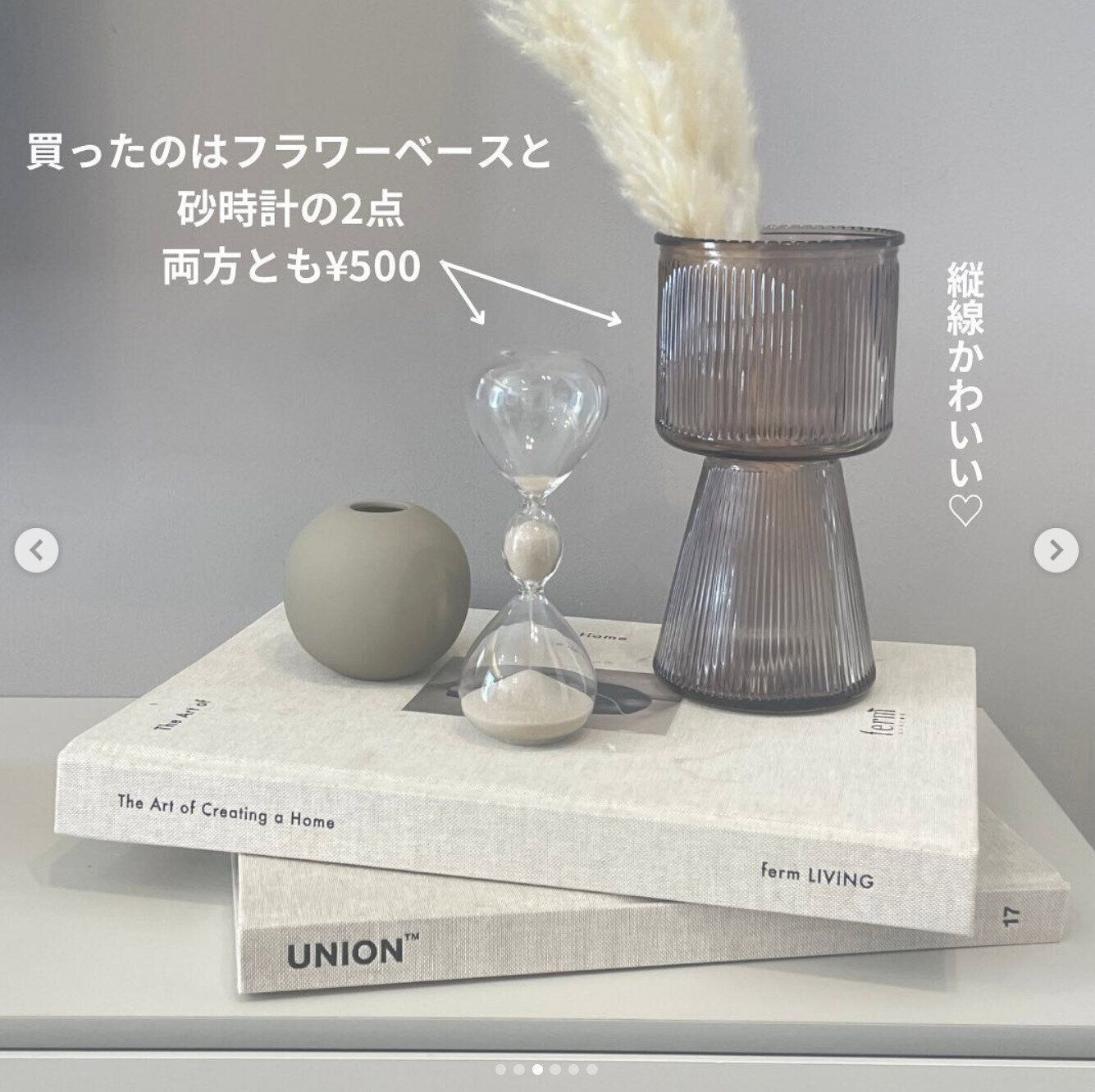 こちらはpome_homeさんが3COINSで購入した砂時計とフラワーベース。可愛さと1個550円という安さに惹かれてついつい買ってしまったのだそう。秋らしいカラーでお部屋の雰囲気が変わったのだとか。砂時計はどこに置いてもおしゃれになるとのこと◎