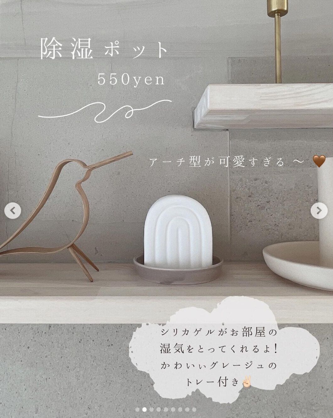 ___an.ieさんが購入したのは3COINSの「除湿ポット」。お部屋の湿気をとってくれるアイテムのようですが、アーチ型が可愛くてインテリアにもぴったりですよね。小さめサイズで洗面台などスペースが限られている場所にも飾りやすいのだとか。こちらはグレージュのトレー付きで550円だったようです。