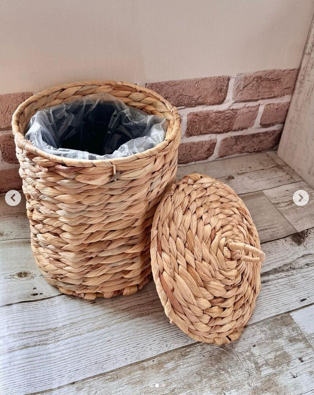 こちらは12hina_himawari31さんが購入した3COINSの新作「フタ付きバスケット」。この方はセリアのゴミ箱を中に入れてゴミ箱カバーとして使っているのだとか。ゴミ袋を隠せるので生活感がなくなり、目に入るたびに気分が上がるそうです♪ こちらは1,100円商品とのこと。