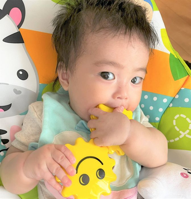 歯車タイプのおもちゃのギザギザ部分が好きみたい。歯ぐきに押し当てるようにして夢中でかんでいます。まだ歯は1本も生えていませんが、歯ぐきがムズムズするのかも。