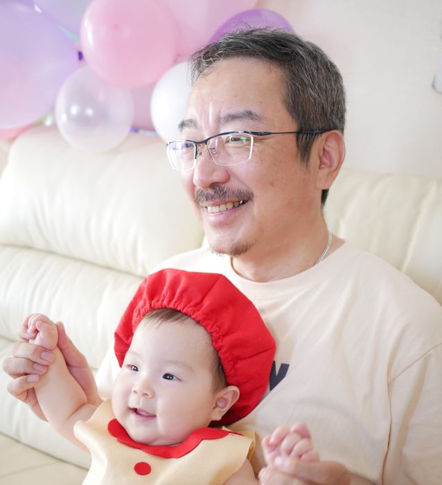 記念すべきハーフバースデーは私の実家でイベントをしました。かわいい衣装を着て撮影も。こちらはじいじ(私の父)とのツーショットです。半年前はまだ目もしっかり開かず寝てばかりだったのが、今ではたくさん笑って、たくさん動いて、大きく成長しました。ママ歴、パパ歴も半年たったんだなあと感慨深いです。