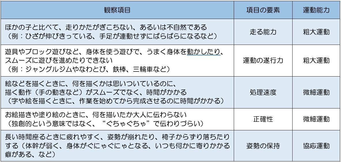 幼児期には、歩行ができるのが遅い、よりかからずに座ると不安定、ボタンやファスナーをうまくとめられない、平らな場所でも転ぶ、食べこぼしが多い、走り方がぎこちない、片足立ちができない、ダンスの模倣ができないなどが見られます。