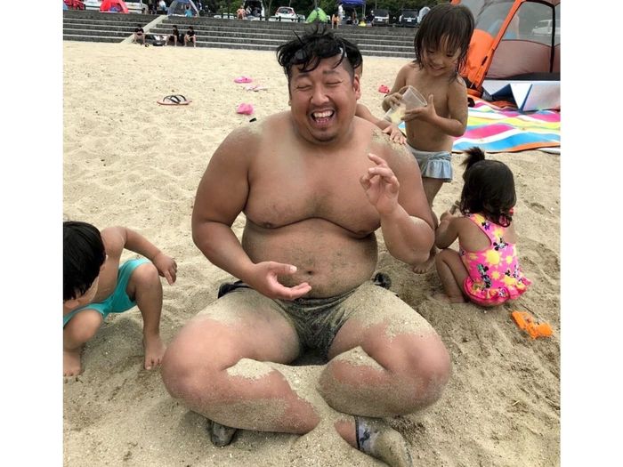 2021年ごろ、家族で海水浴へ。ノッコンさんに砂をかけまくって遊ぶ子どもたち。