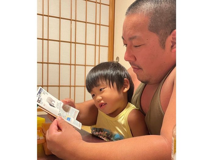 動物が大好きな好きな三男に図鑑を読んであげるノッコン寺田さん。