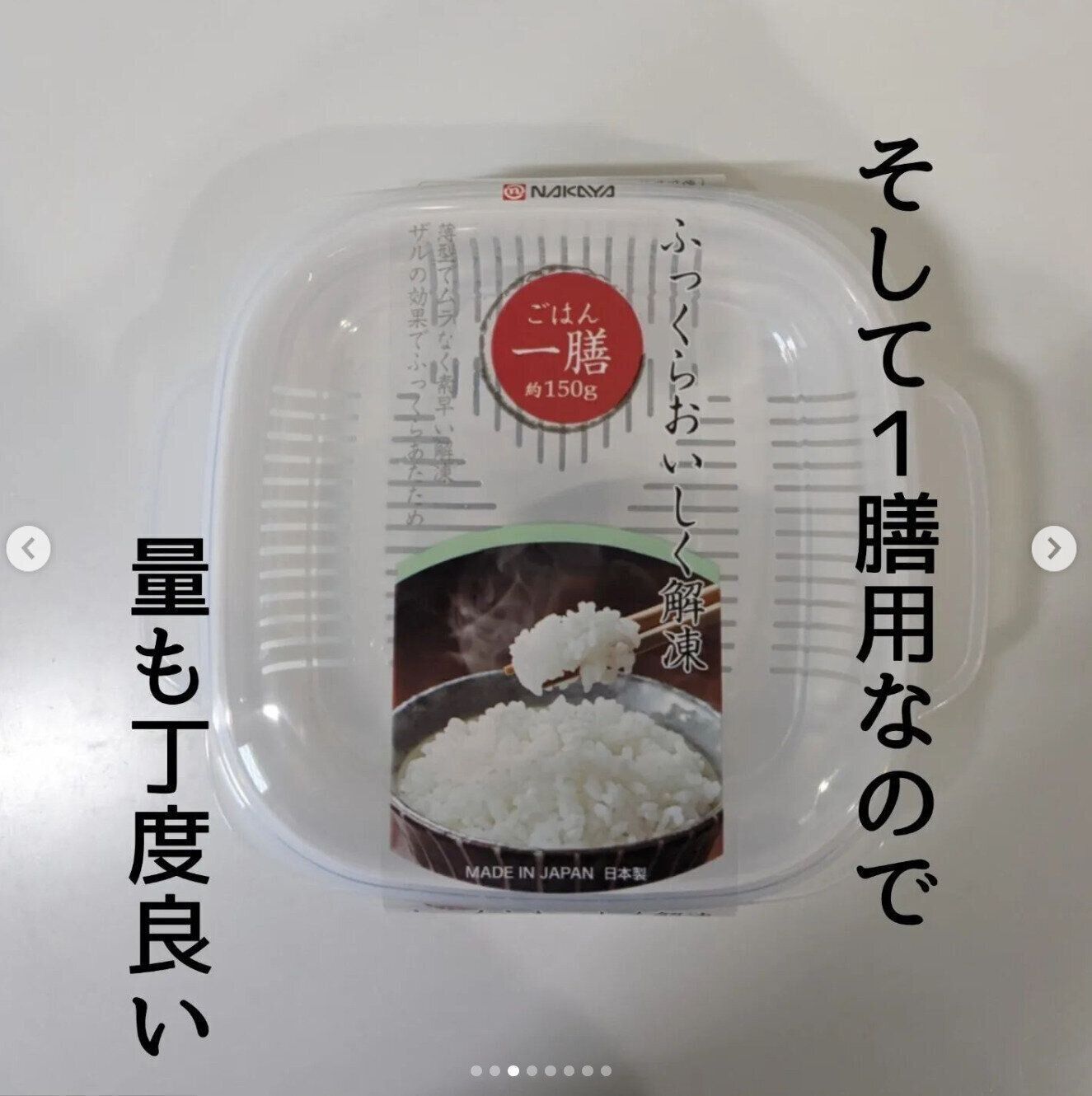 こちらは100enmamaさんがセリアで購入した「ふっくらパック ごはん一膳」。ザル付きの保存容器で、冷凍したごはんをふっくらおいしく解凍できるのだそう。量もちょうどよく「もっと早く買えば良かった」と、とっても気に入っている様子♪