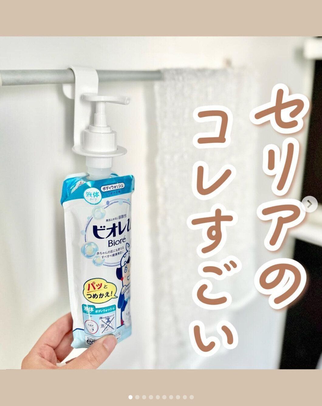 こちらはrisaroom28さんがセリアで見つけた「タオルバーにかけられる パウチ用ポンプ」。シャンプーやボディソープの円柱型の詰め替えパウチに直接取り付けられるポンプなんだとか。浮かせる収納が叶い、「これで110円は安すぎん?」とコスパのよさに大満足のようです◎
