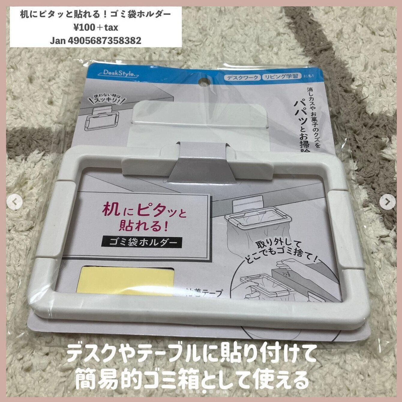こちらはakaneko715さんがセリアで購入した「机にピタッと貼れる!ゴミ袋ホルダー」。机に貼り付けて袋をセットすると、簡易的なゴミ箱になるのだそう。フレームは取り外し可能で、ゴミがある場所に移動させることもできるようです♪ 気になったときにサッとゴミが捨てられて便利そうですね。