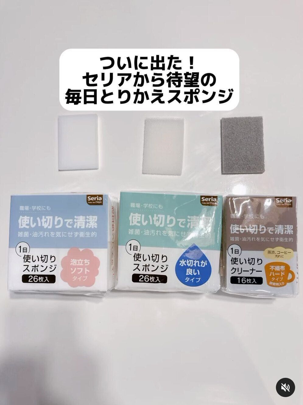 こちらはsally_okatazukeさんがセリアで購入した「1日使い切りスポンジ」。薄手のスポンジが26枚(不織布ハードタイプは16枚)入って110円なのだそう。使い捨てられるので衛生的で、シンクもすっきりするんだとか♪ いろいろな種類があり用途によって使い分けられるのもうれしいですよね。