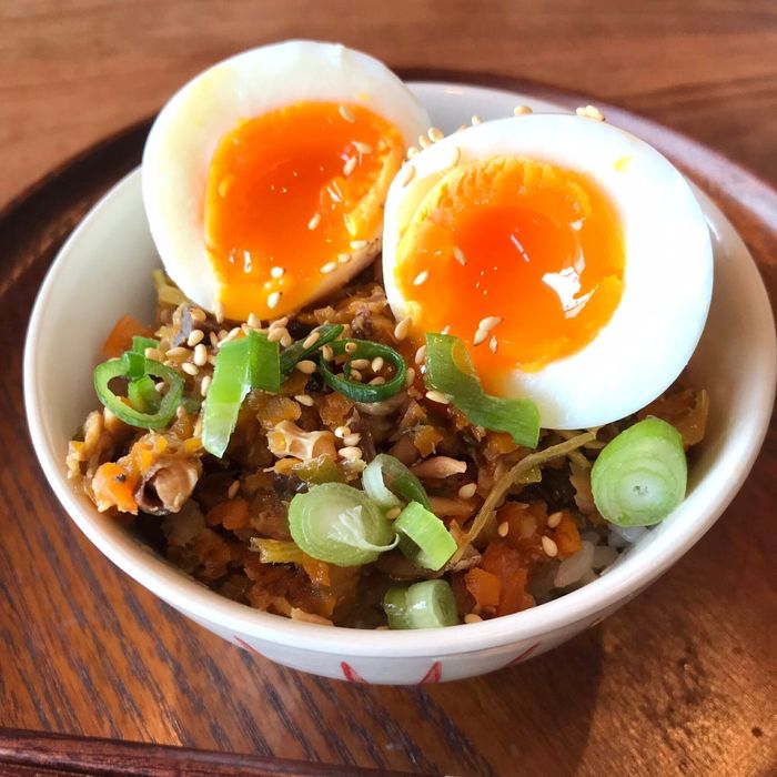 「野菜入りの鶏そぼろ丼」は、家にある野菜をフードプロセッサーでこまかく刻み、水で戻したひじき、たっぷりの鶏ひき肉と絹豆腐をよく混ぜ、フライパンで蒸し焼きに。味つけは、少量のしょうゆとケチャップ。水溶きかたくり粉で少しとろみもつけました。