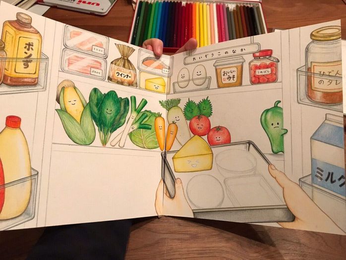 絵本『まほうのわくわくおにぎり』のこの見開きは、完成まで1週間。忙しい日はデリバリーを活用。