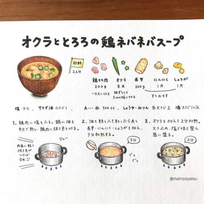 「オクラととろろの鶏ネバネバスープ」の手描きレシピ。