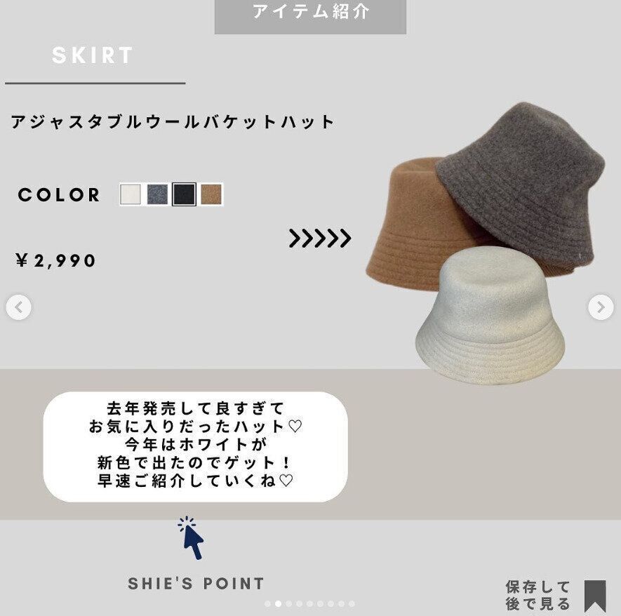 shieさんは「アジャスタブルウールバケットハット」の新色ホワイトを購入。ブラウンとグレーは昨年大活躍したので、気になっていたホワイトも追加でゲットしたんだそう。割と深めでシルエットも良いんだとか。シンプルなコーデにハットを被るだけでオシャレになるので、かなり使えますよね♪