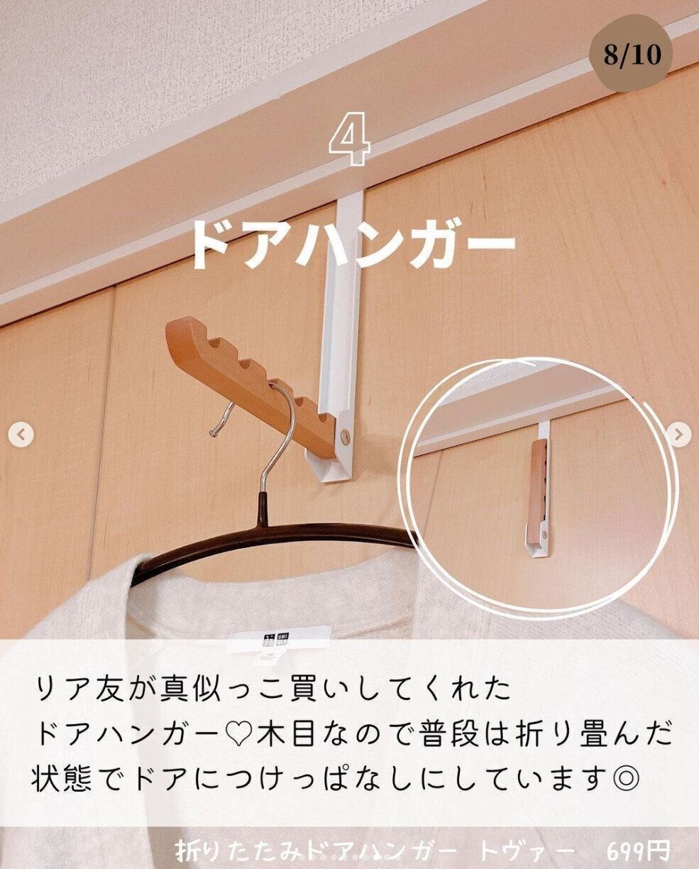 ぽよさんは「折りたたみドアハンガー トヴァー」を購入。お出かけ前のお洋服をサッと掛けたり、洗濯ものを干したりと便利ですね!普段は折りたたんでつけっぱなしにしているんだそう。インテリアにもなじむ木目デザインが、なんともオシャレで素敵ですね。