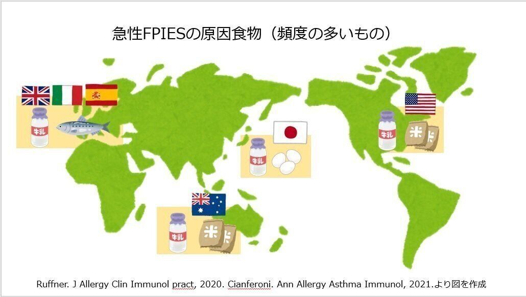 急性FPIESの原因になりやすい食物として、多くの国で牛乳が挙げられますが、それ以外は国によってさまざまです。たとえば、日本は卵、アメリカは米や小麦、ピーナッツ、イギリスやイタリアは魚、オーストラリアは米が原因食物になる頻度が多いと報告されています。国によって原因食物に違いがある理由も今のところ不明です。