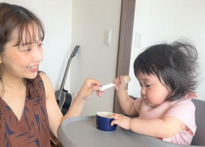 スプーンを見ると奪って食べる気満々。ただ、離乳食を口に入れるとブーッと吹き出すのが楽しいよう。困った遊びを覚えてしまい、私は頭をかかえているところです。