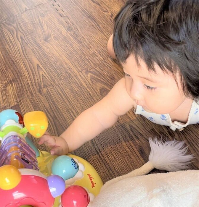 後追いは相変わらず続いていて、私の姿が見えないと泣いてしまいます。でも、いろいろなおもちゃで器用に遊べるようになったり、気になるものに手を伸ばして引っ張ったり持ち上げたりして、私がそばにいれば1人で娘なりの遊び方で過ごせるようになってきました。