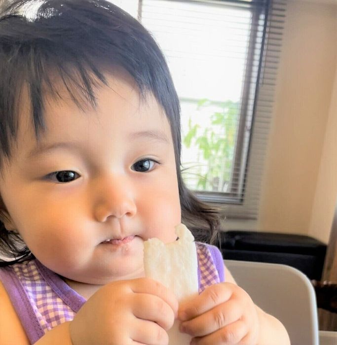 赤ちゃん用せんべいを上手に持ってポリポリ。手先が器用になって、いろいろなことが上手にできるようになってきた髙田琉衣(るい)ちゃんの9カ月の様子を紹介します。