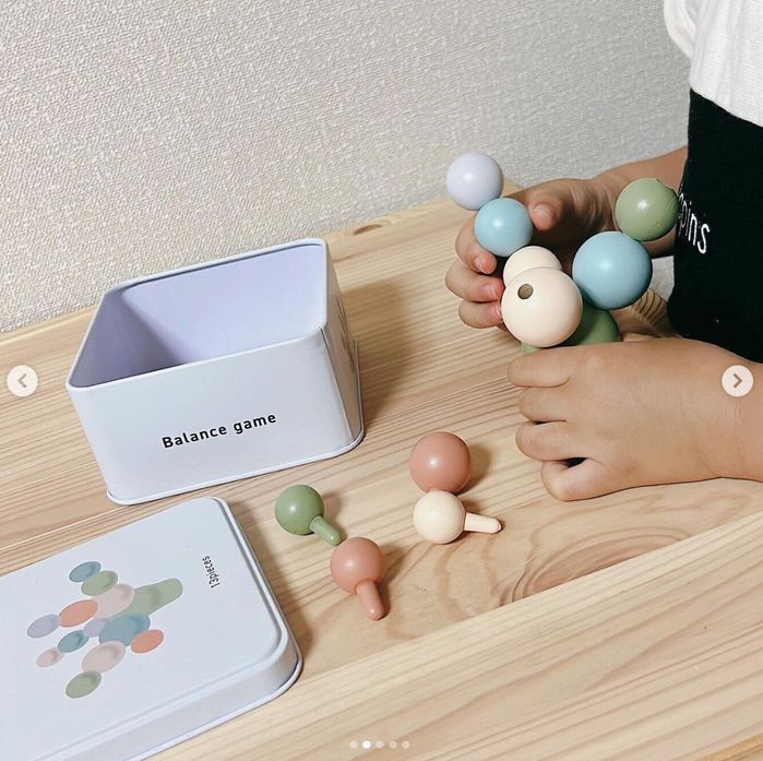 こちらはon__gram.sさんが3COINSで購入したバランスゲーム。土台が倒れないようにバランスを保ちながら、13個のパーツを組み立てて遊ぶおもちゃのようです。缶に入っているので持ち運びや片付けがしやすそうですね♪ こちらは550円商品とのこと。