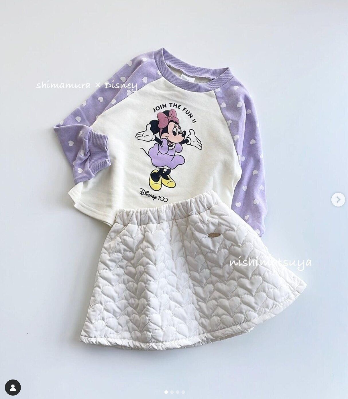 shiichan_ksnさんはしまむらのディズニーコラボトップスをGET!ボトムスには西松屋のキルティングスカートを合わせたそうで、パステル調の色味がとても可愛らしいですよね!トップスは1,089円とのこと。