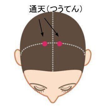 「通天」は頭にあるツボで、鼻筋から左右に親指の幅分外側で、前髪の生え際から指6本分後ろに位置します。押しやすい中指などでじんわり押してみてください。