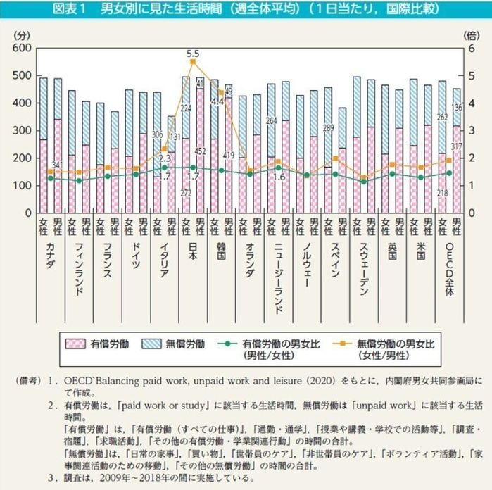 日本人男性は、家事・育児などの無償労働の時間が世界的に見て極端に少ないですが、有償労働(仕事)の時間が非常に長く、家事・育児に使える時間がないという現実があります。
