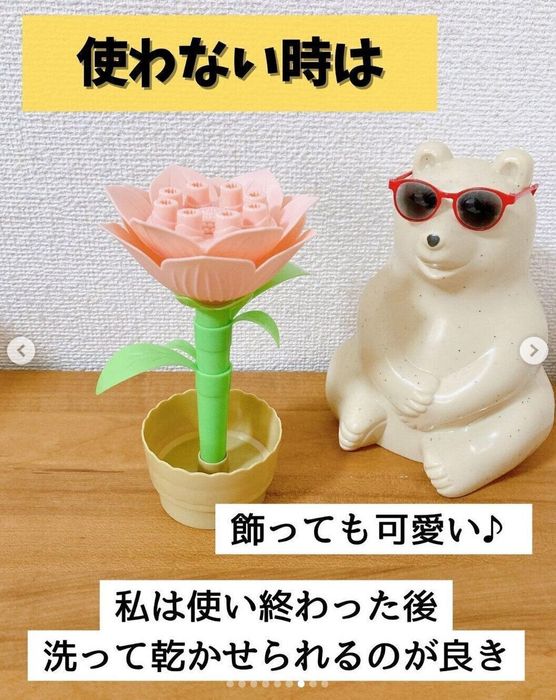 こちらはhachiha.ikujiさんがセリアで購入した「フラワーシャボン」。お花の形をしたシャボン玉で、使わないときは付属の鉢にさして飾っておくこともできるのだそう。パーツは分解可能で組み合わせ遊びも楽しめるんだとか◎