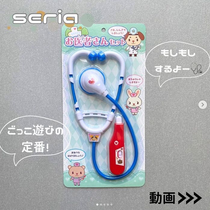 こちらはkii_mama_3156さんがセリアで購入した「お医者さんセット」。聴診器と体温計のセットで、体温計は目盛りが動かせるようになっているんだとか。お子さんはぬいぐるみやパパ・ママのお世話をして遊んでいるそうです♪