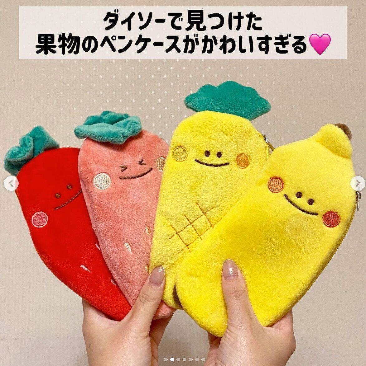 こちらはダイソーで販売されている、くだものペンケース。omame__lifeさんは、イチゴやバナナ、パイナップルのペンケースをゲットしたそうです♪ お気に入りのお絵かきグッズはもちろん、お菓子やヘアアクセなどを収納してもかわいいですね!