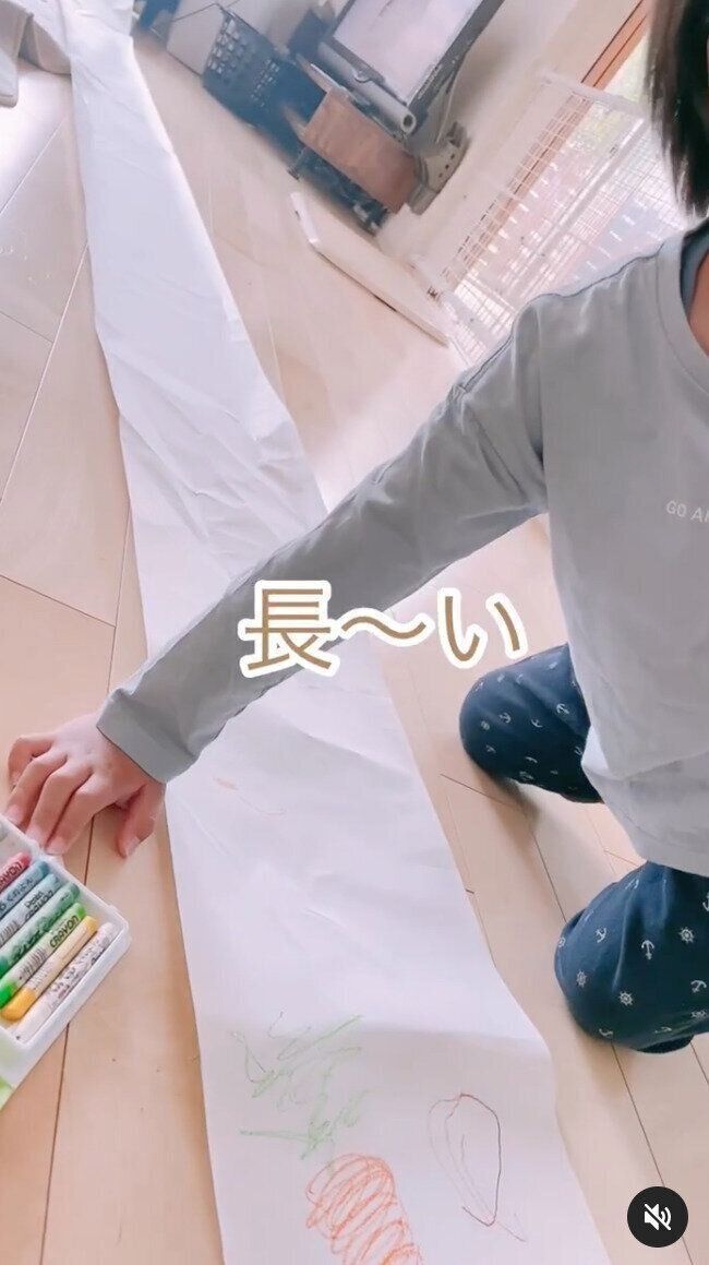 こちらは、​​ダイソーの「らくがきロールペーパー」です。ラップのような細長い箱に、ロール状のお絵かき用紙が入っているというもの。紙は長さ10mもあり、壁に貼って、お絵かきを楽しむこともできるんだとか♪