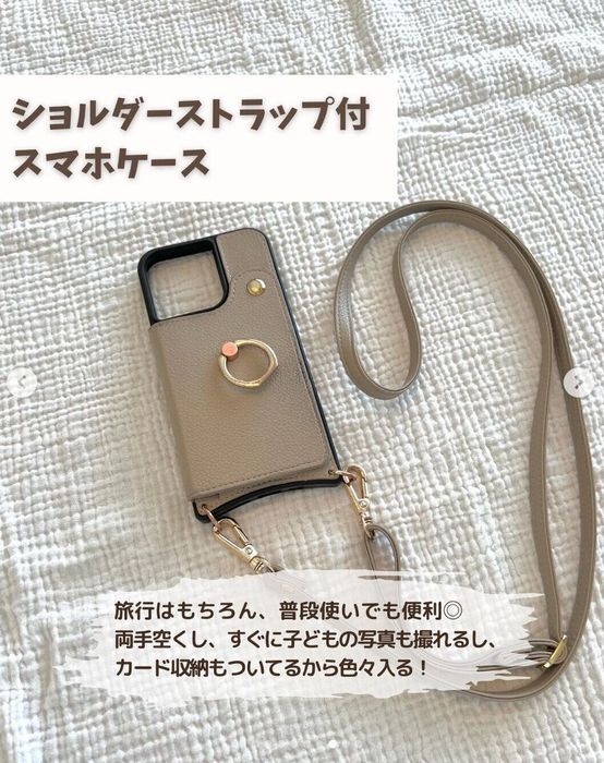 こちらはchiicoco_mamaさんが楽天で購入したニーノスのショルダーストラップ付きスマホケース。両手が空いて、すぐにお子さんの写真も撮れるので、旅行はもちろん普段使いにも重宝しているのだそう。コンパクトな見た目ですが、カード収納も付いているんだとか◎