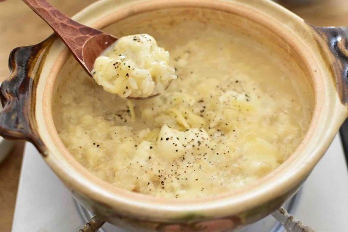 水でさっと洗ったごはんを鍋のスープに入れて沸騰したら無調整豆乳を加えてピザ用チーズ加える。鍋のフタをしめて加熱しチーズがとろけたら好みでブラックペッパー、オリーブオイルを添える。