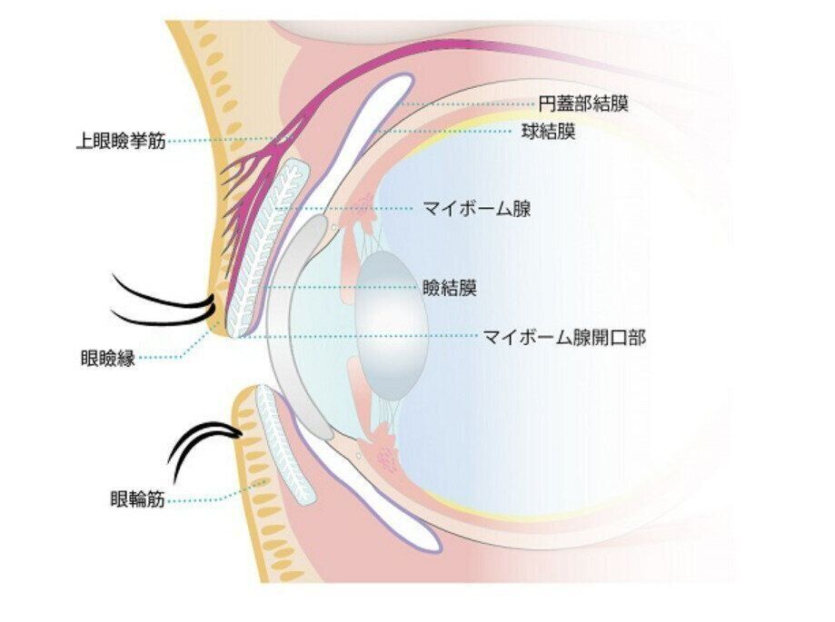 まぶたには「マイボーム腺」という脂質を分泌する腺があります。マイボーム腺はまぶたの中にある瞼板(けんばん)という構造の中を縦に走っている腺です。標準的な人では、上まぶたに30〜40本、下まぶたに20〜30本のマイボーム腺があります。