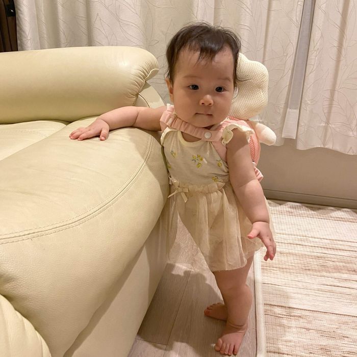 つかまり立ちをするようになったので、万が一転倒したときに頭を強くぶつけないように、リュック型のけが予防クッションをつけるように嫌がらずにつけてくれてひと安心。後ろから見ると羽根がついたデザインで、背負った姿が妖精のように見えてかわいいです。